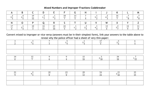 Mixed Numbers And Improper Fractions Codebreaker Teaching Resources
